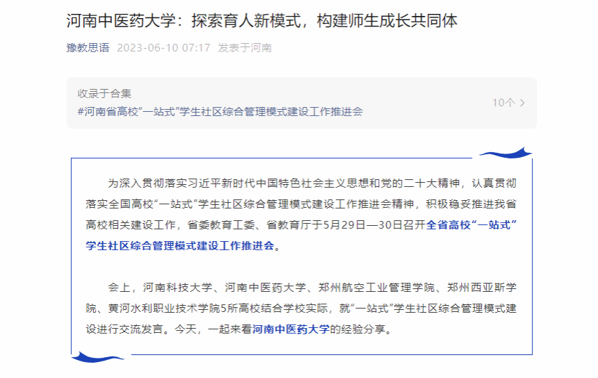 学校党委高度重视,注重顶层设计,认真做好符合学校实际的“一站式”学生社区建设。坚持稳中求进的总基调,制定《米兰(中国)书院与学院双轨协同育人模式改革实施方案》。自2021年起,相继成立了本草书院、尚真书院、仲景书院,设立三个书院党委,组建领导班子,成立育人中心。中医学类、中药学类、医药相关类共6500多名学生入驻书院实行“一站式”学生社区管理。两年来,学校投资1000余万元、近6000平方米的“一站式”学生社区建成投入使用,满足了学生学习生活的需要。