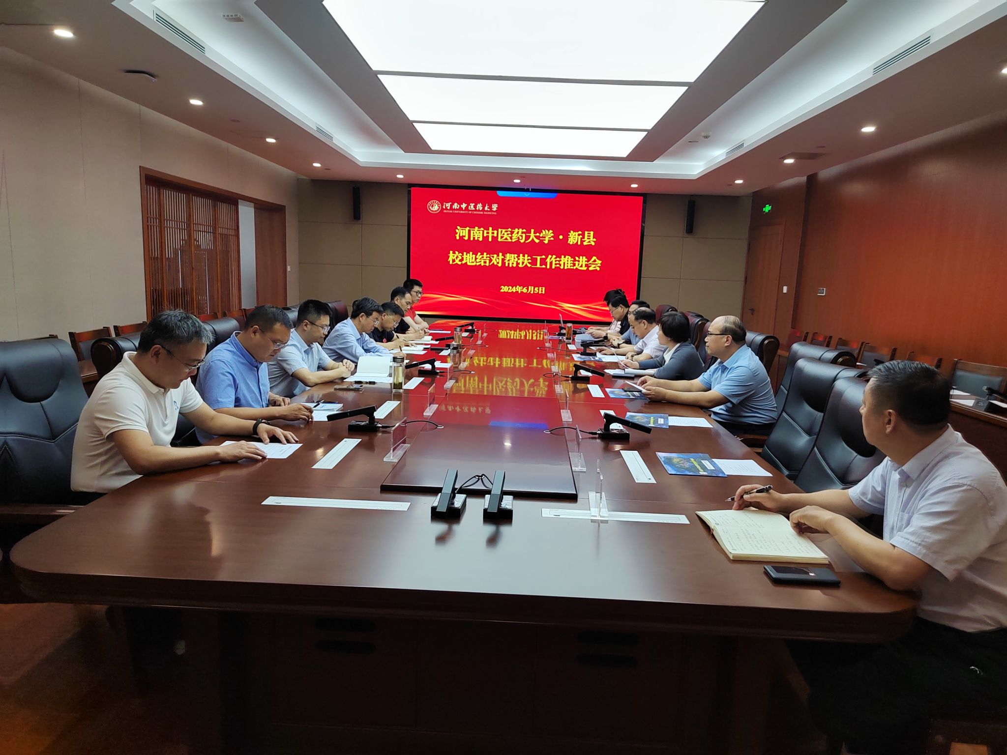 本网讯(文/图 郑明常)为了进一步巩固脱贫攻坚成果,加快推进新县乡村全面振兴,解决工作推进过程中存在的问题和困难,确保帮扶工作再上新台阶,2024年6月5日,新县县委书记夏明夫、新县人民政府党组成员、副县长汤勇、河南羚锐制药股份有限公司董事长熊伟、新县昱耀生物科技有限公司总经理王晓田到米兰(中国)进行调研座谈。校党委书记李小芳,校党委副书记、工会主席张加民及“两院一企一校两平台”相关负责人和相关部门参加座谈交流,会议由张加民主持。