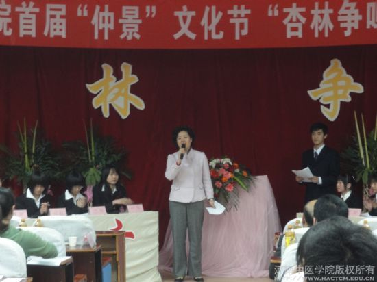 院党委副书记张丽霞致开幕词。她说河南中医学院首届大学生仲景文化节以弘扬仲景文化、展示青春风采为主题,建设优良校风、学风为核心,融科技、文化、艺术为一体,突出学术性,目的是倡导和建立有利于青年学生成长成才的,特色多样的,高品位的校园文化氛围,文化节是全校大学生的文化大餐、精神盛宴、青春盛会和才艺舞台。希望同学们能够积极参与文化节的各项活动,只有参与才能有收获,才能提高。张书记强调,辩论赛是文化节的重要内容,希望同学们通过辩论进一步增加对相关问题的认识、理解,更希望参与“杏林争鸣”辩论赛的同学在辩论赛中能够赛出智慧,赛出水平,赛出风格。