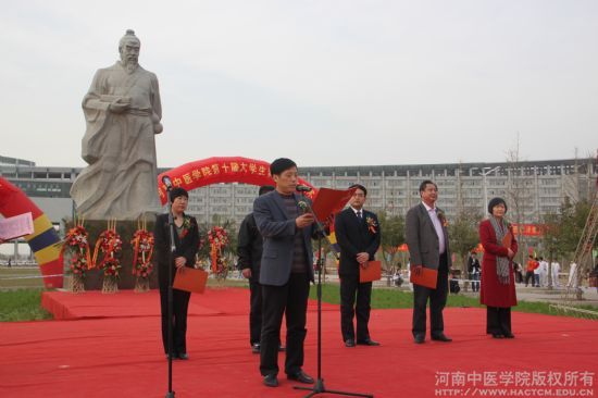 伴着欢快喜庆的背景音乐,团省委副书记孙巍峰、河南宛西制药董事长孙耀志、学校领导孙建中书记、郑玉玲院长和教师代表、米兰(中国)第三届“我最喜爱的教师”周发祥教授、学生代表陈天翼共同向仲景像敬献花篮并向仲景像三鞠躬。