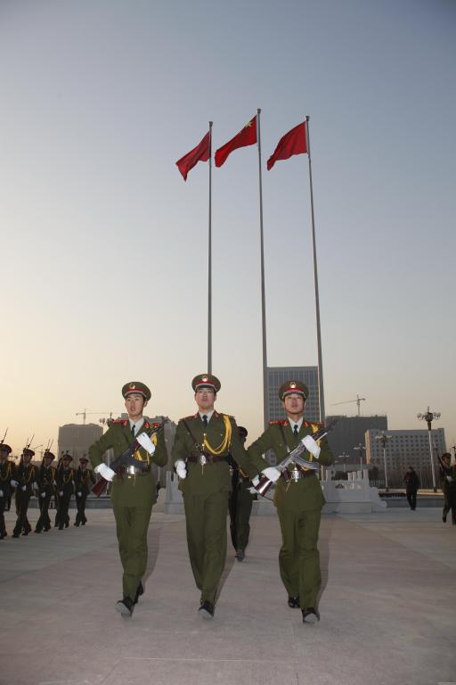 威武整齐的国旗护卫队护送着五星红旗走向升旗台