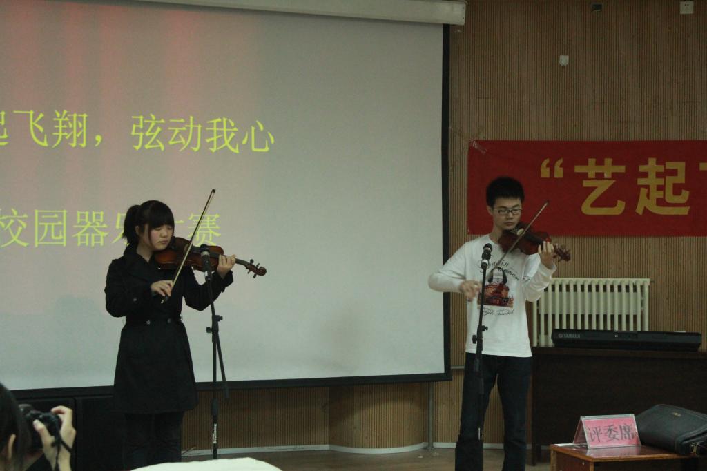 比赛分为西洋乐和民乐两种类型,共有20组选手进入决赛。选手们各展才艺,表演的节目涵盖了二胡、古筝等中国传统乐器,吉他、小提琴、萨克斯等西洋乐器,场面气势恢宏,鼓乐笙箫。西洋器乐的选手们通过激昂的音乐赞美美好生活,小提琴合奏《新春乐》让听众身临其境,感受到新春的快乐;民乐选手们向我们展现了中华古典器乐的音律美,古筝独奏《战台风》时而舒缓、时而急促,技巧娴熟,使在场的观众完全陶醉在音乐的梦境中,如痴如醉。比赛现场,评委老师们从演奏技巧,表现方式,难易程度等方面对节目进行评比,最终,傅阳、杜雨菲同学的小提琴合奏《新春乐》获西洋乐组一等奖,闫欣慧同学的古筝独奏《战台风》获民乐一等奖。