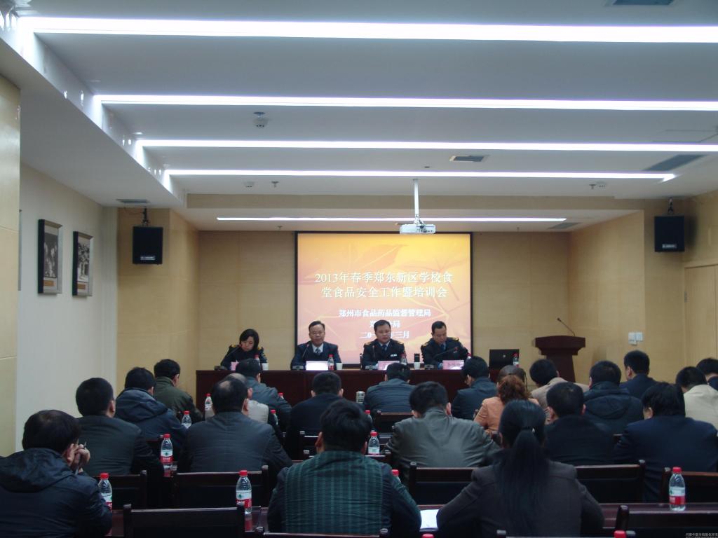 2013年 3月29日上午,郑州市食品药品监督管理局郑东分局2013年春季学校食堂食品安全工作暨培训会在米兰(中国)召开。郑东分局局长卢高义,党组成员、主任科员李冠峰,纪检书记白琚,监督员王文生,我院副院长付强、院长助理张小平和后勤集团公司党总支书记陈德宝、总经理朱建光、副总经理杨清华,以及郑东新区21所学校饮食主管领导和相关负责人参加会议。