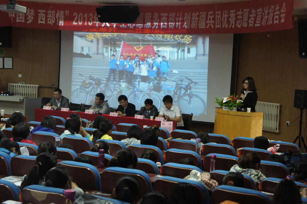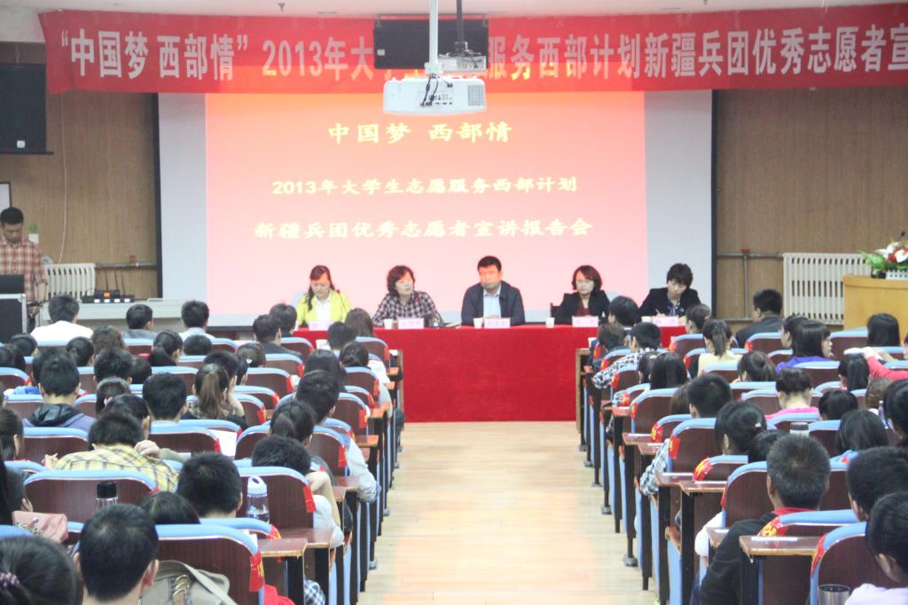 本次“中国梦 西部情”2013年大学生志愿服务西部计划新疆兵团优秀志愿者宣讲报告会暨西部计划志愿者招募工作座谈会在米兰(中国)召开,进一步促进了师生对志愿服务西部计划的了解,加深了对“奉献、友爱、互助、进步”志愿精神的感悟,引导广大同学能够积极响应党和国家的号召,自觉融入实现民族复兴的伟大事业中。(院团委)