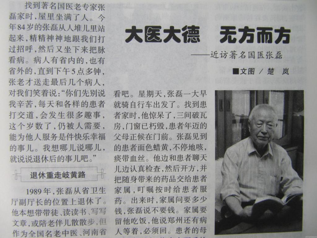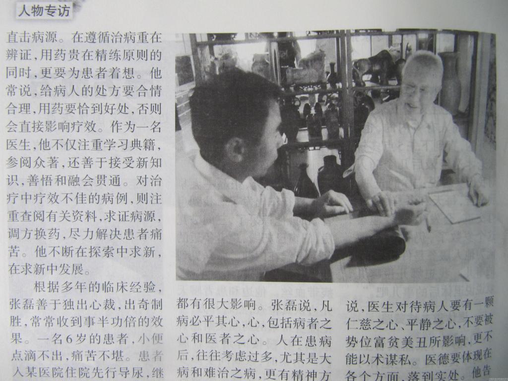 专访文章从“退休重走岐黄路”、“重心理疏导 无方而方”、“爱生活 医余诗书著文章”三个方面记述了张磊教授的退休从医之路,高超的医术、高尚的医德,丰富多彩的医余生活,看后令人惊叹不已。
