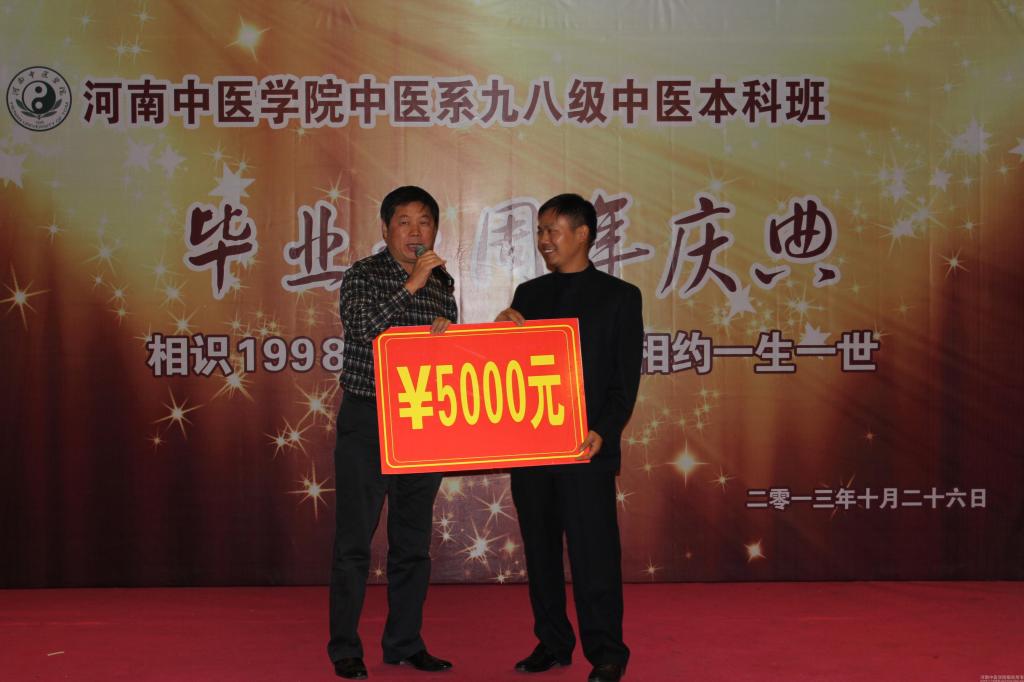 1998级中医本科班年级长王松涛代表同学们在聚会上向母校捐款5000元,感谢母校的培养和老师的教诲,祝愿母校各项事业取得更好的成绩,祝福母校的未来更加辉煌!