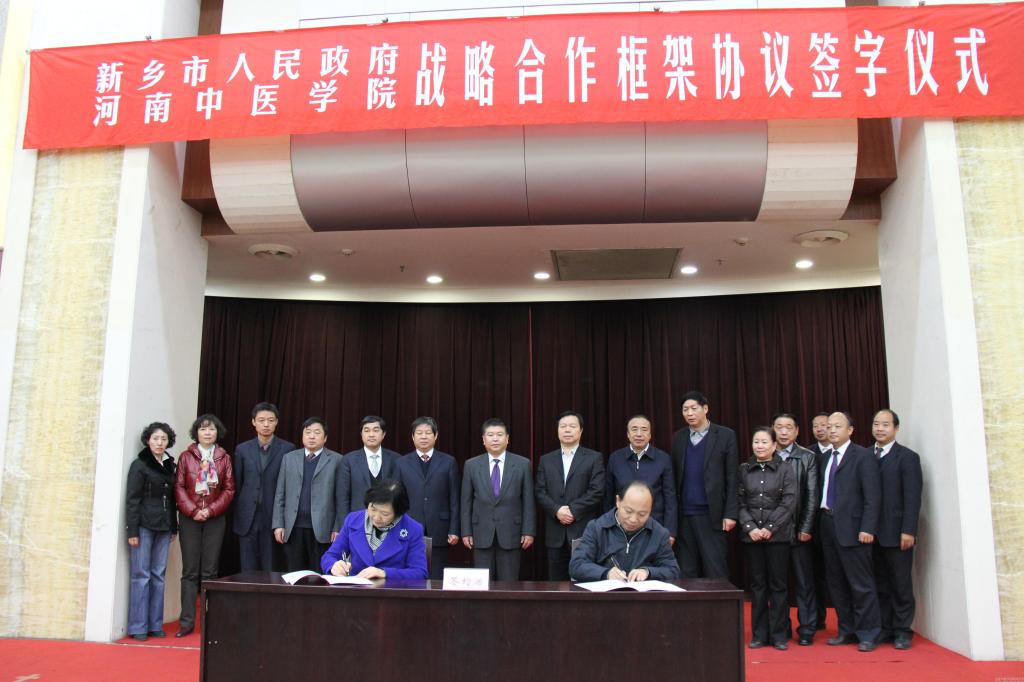 院长郑玉玲和新乡市副市长杨书廷分别代表双方签署《河南中医学院与新乡市人民政府合作框架协议书》。