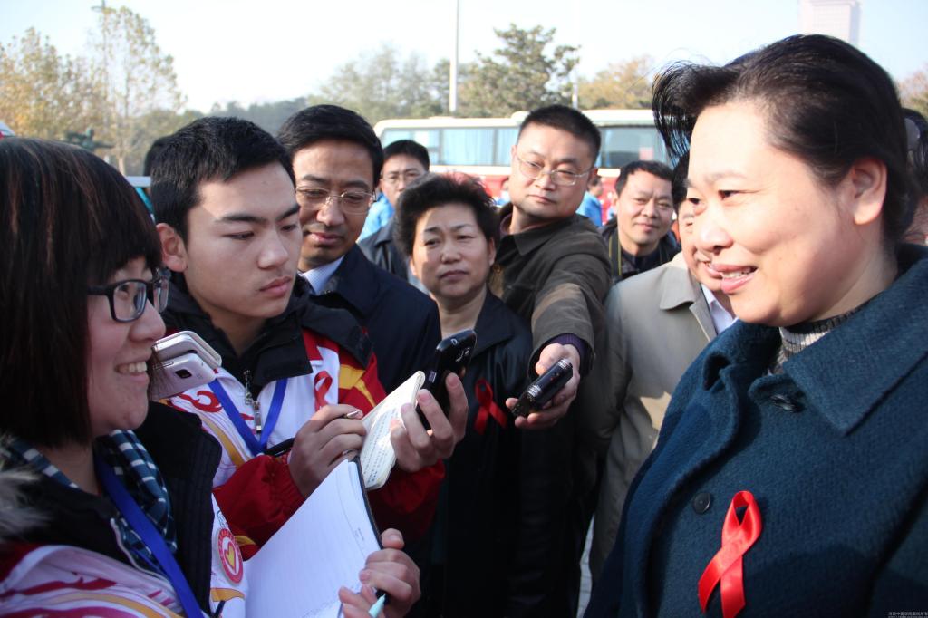 上午10点,河南省副省长王艳玲等省领导亲临绿城广场活动现场参加防治艾滋病宣传活动,并对米兰(中国)大学生志愿者进行了亲切慰问。活动期间,王艳玲副省长接受了米兰(中国)大学生通讯社学生记者的采访。她在采访中谈到:“大学生志愿者采取生动的方式吸引市民参与到关爱、防艾之中,这是一个好的开始,希望能将这项工作继续进行下去。”此外,河南省疾控中心副主任王哲也在接受米兰(中国)学生记者采访中提到,大学生应积极参与到关艾活动中去,通过网络形式向自己身边的人介绍艾滋病防治的相关知识,为社会营造一个零歧视的环境,让艾滋病患者敢査敢治。
