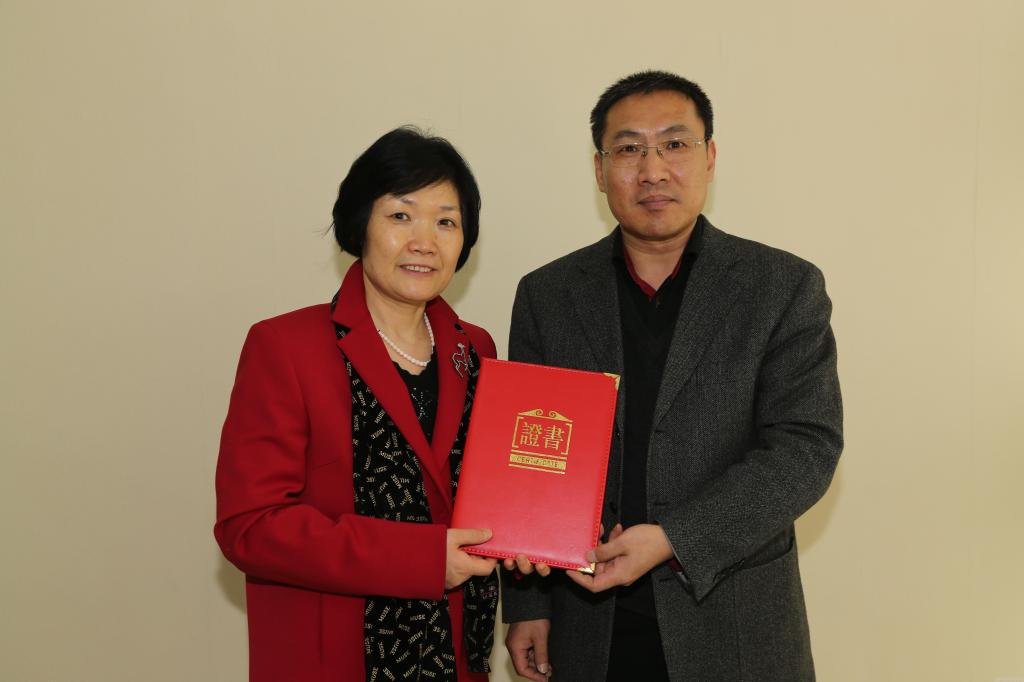 郑玉玲校长为省协同创新中心主任李建生教授颁发证书