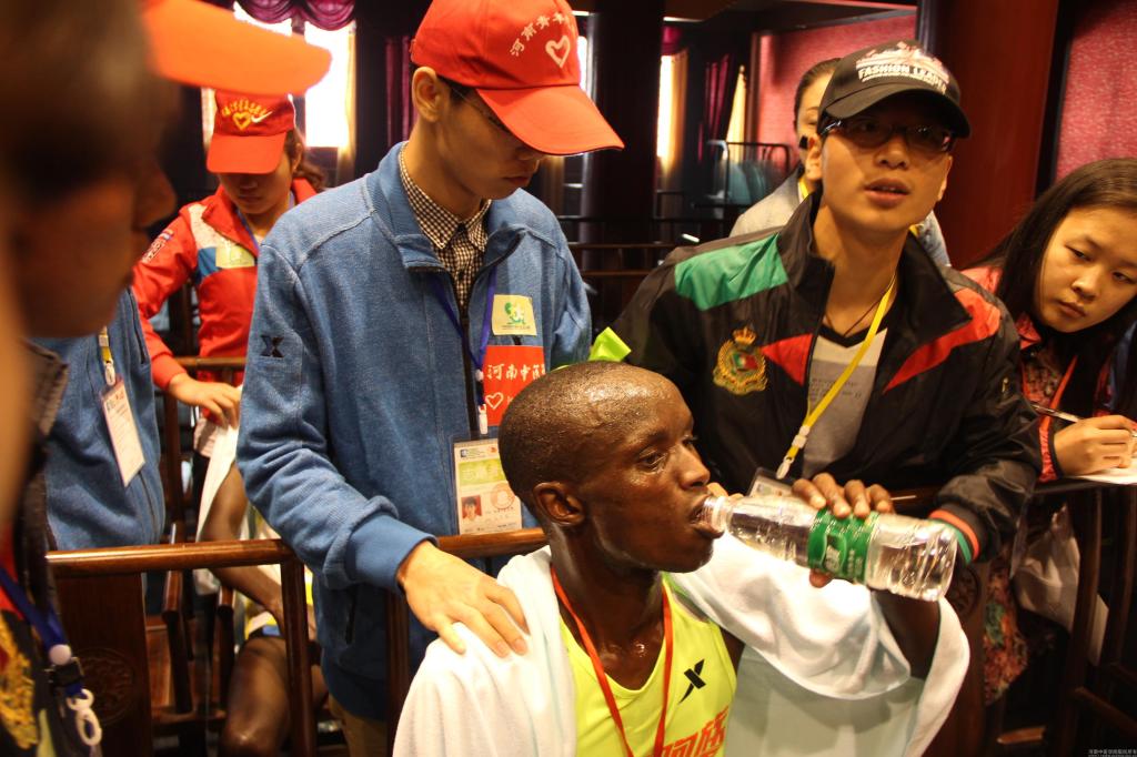 米兰(中国)志愿者为郑开马拉松赛男子组冠军也根·威廉姆·基辅罗诺提供推拿服务