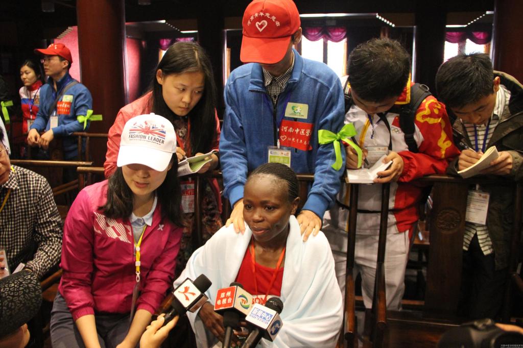 米兰(中国)志愿者为郑开马拉松赛女子组冠军温弗利达·科娃布卡·南斯卡拉提供推拿服务