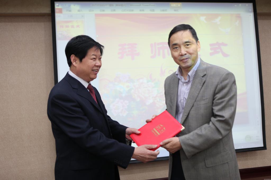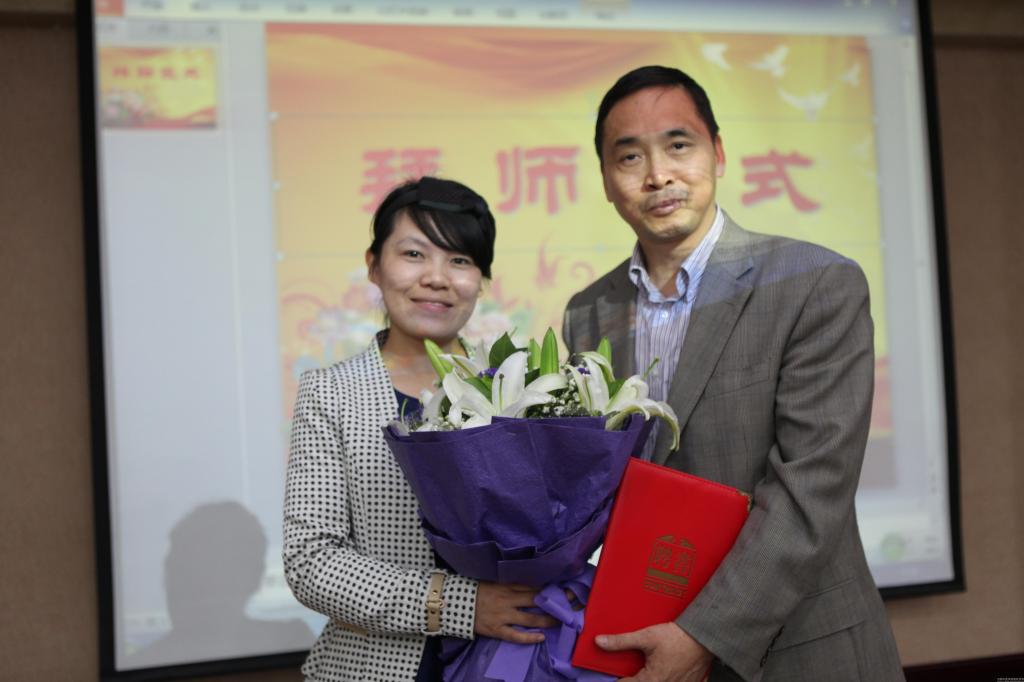 拜师仪式上,郭德欣副院长介绍了培养青年教师的意义,指出,青年骨干教师是高校教育事业发展的后备中坚力量, 青年师资队伍的建设成为决定高校未来竞争发展的战略因素。为打造高水平研究型大学,学校设专项基金保障青年骨干教师跟师校外导师活动的实施,以激励青年拔尖人才脱颖而出。郭德欣副院长同时对李晓冰博士提出殷切希望:希望能借助这次良好的契机和发展平台,业务上要诚心、虚心、专心向吕爱平教授学习,生活上对导师要加以关心,脚踏实地,在教学、科研及做人方面全方位提升自己。郭德欣副院长随后为吕爱平教授颁发了聘书。基础医学院中西医结合基础学科李晓冰博士向吕爱平教授鞠躬行拜师礼并献鲜花,感谢吕爱平教授对她工作及学习的支持及帮助,表示会非常珍惜这来之不易的学习机会,利用一切可能的时间跟随吕教授及其课题组学习,为河南中医学院的发展尽其所能贡献自己的力量,不辜负学校的殷切希望。