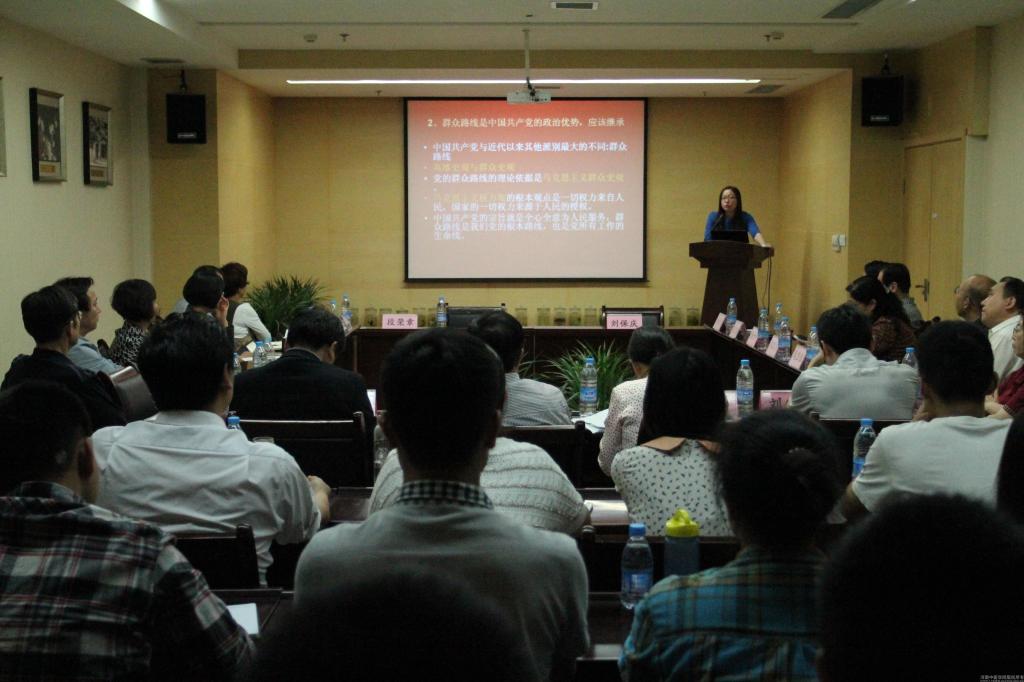 会议第二阶段,校教育实践活动宣讲团成员、思政部教师李永菊博士作了题为《坚持群众路线的必要性及新形势下的路径选择》讲座。她从权力本源决定执政为民的理念展开,系统阐释坚持群众路线的必要性,并理论与实践相结合,提出了新形势下如何开展群众路线的路径选择。讲座内涵丰富,深入浅出,使大家加深了对群众路线的理解和把握。
