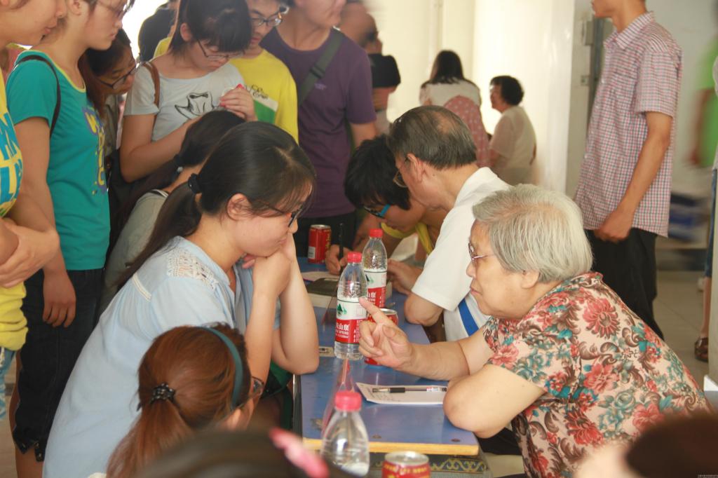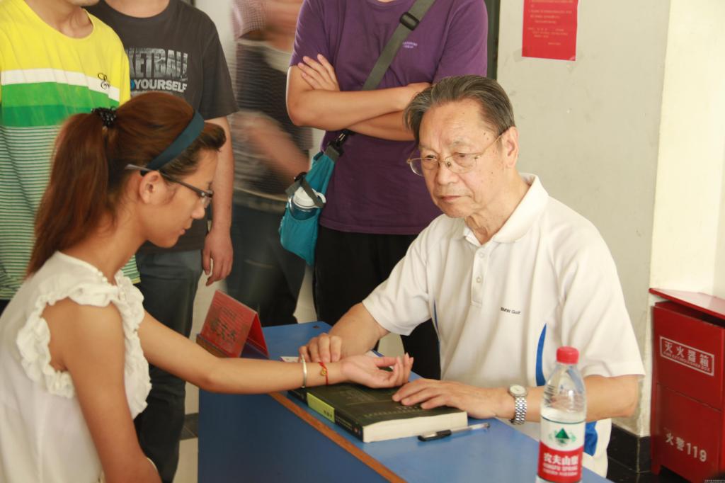 此次活动分为三个部分:一是义诊、答疑。由内科杂病专家邵文杰教授、李玉香教授、内科兼妇科专家张玉芳教授对学生耐心传授内科诊病辩证方法与现场开方。当日,前来学习、问诊的同学络绎不绝,各位老教授老师们不顾炎炎夏日,耐心细致的为同学们认真把脉、“望闻问切”,回答同学们在学习中的疑问,根据同学们提出的症状开出药方。二是辨认中药材。在志愿者服务队同学们帮助下,三楼大厅北边的空地上,七、八条横幅上摆满了各种各样的地道中药材或伪品标本,这是米兰(中国)原中药鉴定学科曹继华教授数十年在全国各地收集、珍藏的药材标本。前来学习的同学们细心地辨认着标本,不时地拿出手机拍下来自己感兴趣的或拿着标本去向曹继华教授问疑。曹继华教授都会认真热情地给大家讲解,并教同学们如何鉴别中药。第三举办讲座。A337教室也是座无虚席,其中不乏慕名而来的学生家长。路世才教授为同学们悉心讲解他多年研究成果——专门治疗近视眼的<<增视功>>。除此之外,路世才教授还介绍了气功的根源、定义、分类、意义以及发展方向,并且特别强调练气功的八字准则:“缓慢、柔和、连贯、协调”。互动过程中,有很多同学提出自己的疑问,路世才教授都一一解难答疑。