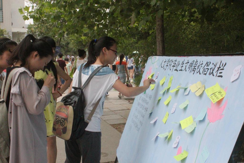 时光荏苒,岁月如梭,又到一年毕业季,2014届毕业生即将离开母校,奔赴祖国各地。为了给全体毕业生创造一个健康、文明、和谐、有序的毕业环境和氛围,日前,人文学院开展了以“怀感恩之心,树自身形象”为主题的毕业生“五个一”主题教育活动。