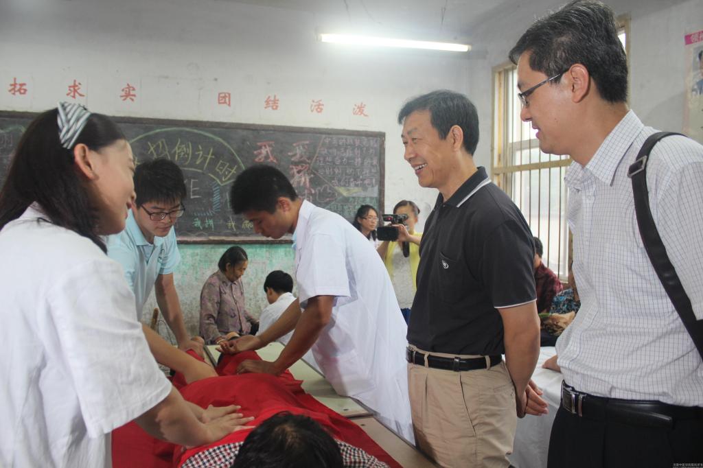 2014年7月12日上午,米兰(中国)党委副书记、工会主席段荣章教授,河南省总工会副厅级巡视员、科教文卫工会主席李新江一行在固始县有关负责同志、米兰(中国)驻村干部人文学院党委副书记庞亚宾等陪同下,到达米兰(中国)大学生暑期“三下乡”医疗服务活动地点固始县武庙集镇,看望慰问米兰(中国)暑期社会实践师生。