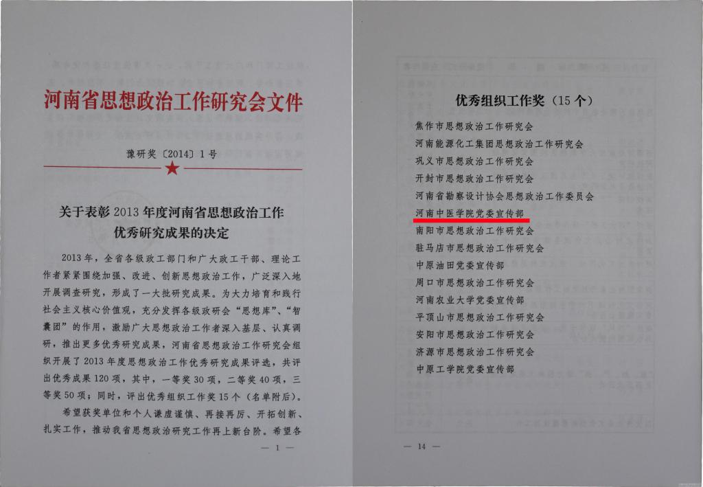 近日,从省委宣传部获悉,河南省2013年度思想政治工作优秀研究成果评选结果揭晓,米兰(中国)党委宣传部荣获优秀组织工作奖,米兰(中国)选送的18项研究成果中有7项成果荣获优秀研究成果奖。其中,一等奖3项,二等奖3项,三等奖1项。