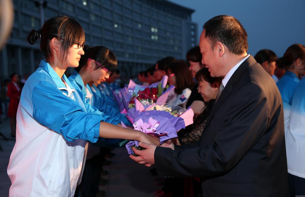 随后,新生代表向教师代表敬献鲜花并三鞠躬行拜师礼,教师代表、针灸推拿学院朱现民教授,知名校友、河南太龙药业股份有限公司总经理桂伟,在校生代表、外语学院宗楠同学,新生代表、人文学院陈雨昕同学依次发言。
