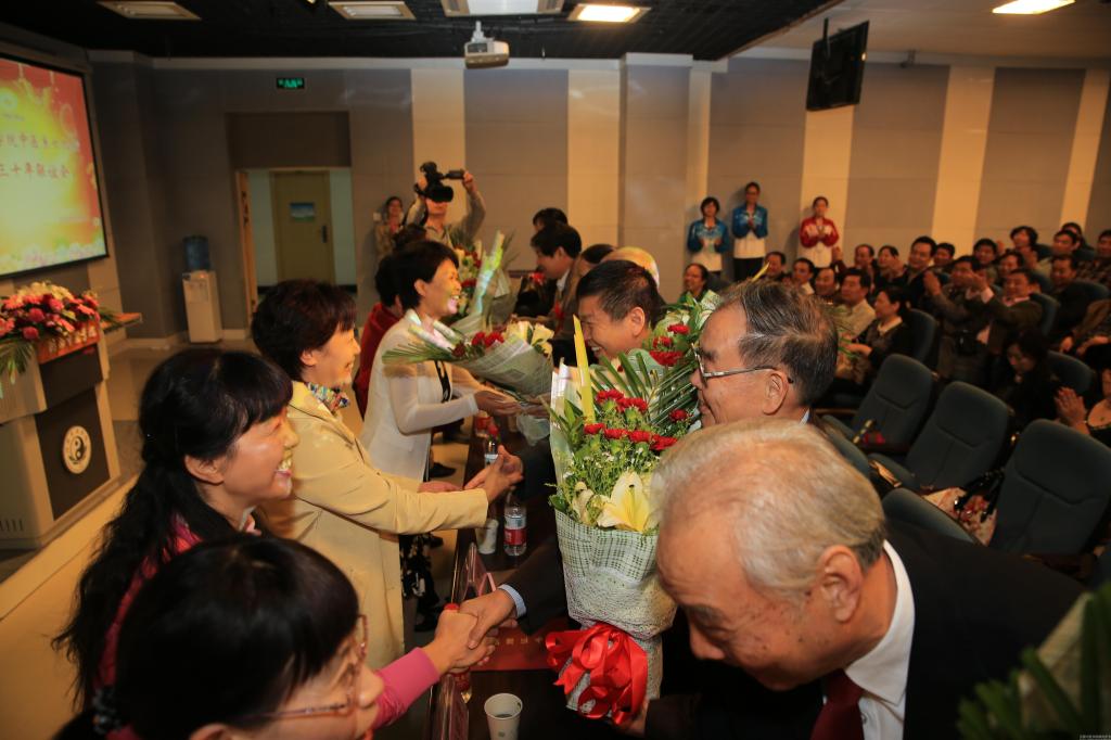 联谊会上,首先奏唱国歌,向我们伟大的祖国致敬,祝愿我们的祖国更加繁荣昌盛!随后,校友向母校领导老师敬献鲜花,感谢母校的培养和老师的教诲,并祝愿母校更加辉煌和美丽!学校党委书记孙建中代表学校党政领导和全体师生员工对79级校友30年后重返母校表示热烈欢迎,向校友介绍了学院近几年来的建设发展情况和取得的丰硕成果。他强调,学校的建设和发展,离不开一代又一代师生的共同努力,也离不开广大校友的关心和支持,希望校友们继续把自己的事业和母校的事业紧密结合起来,共同为中医药事业贡献力量。随后孙书记代表学校接受了79级校友捐赠的“心系母校”黄石砚雕刻摆件,向校友代表马宪民颁发了捐赠证书。