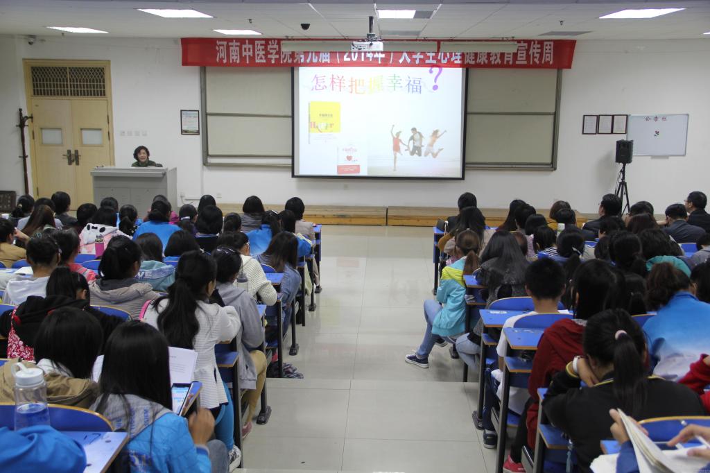 开幕式上,李俊芝主任宣读了《关于开展米兰(中国)第九届大学生心理健康教育宣传周活动的通知》(院学字[2014]31号),对本届心理健康教育宣传周期间的相关活动进行了通报和安排。之后,张丽霞副书记以“积极心理学与幸福人生”为主题,为在场的广大师生作了首场报告。她首先给大家介绍了积极心理学的兴起与发展,并结合自己学习积极心理学的心得体会和生活经验,给大家传授了“把握幸福的方法”:确立明确的目标、学会改变、建立和谐的人际关系、关注自我的积极面和知足常乐。张丽霞副书记精彩的讲解、生动而又富有哲理的故事获得了大家的好评,同时引发了在场师生对于“幸福”的深层次思考。