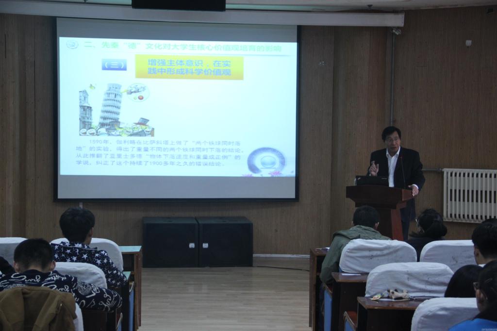 刘保庆部长从“十八届四中全会的主要内容和精神”、“依法治国和以德治国的关系”以及“德法并行,践行社会主义核心价值观”等三个方面为同学们作了详细阐述。在报告会上,他首先向大家传达了十八届四中全会的主要内容和精神,指出践行社会主义核心价值观需要坚持依法治国和以德治国相结合,使法律和道德共同发挥作用。随后,刘保庆部长通过引用大量的史料典籍从“君德”、“民德”、“人德”三个方面阐释了先秦时代“德”文化的基本内涵,还通过焦裕禄、孔繁森以及米兰(中国)刘锁超、朱现民、优秀大学生先进群体等道德典型的先进事迹,向大家说明了先秦“德”文化和模范榜样在大学生核心价值观培育方面的影响。最后,他强调了德法并行,践行社会主义核心价值观的主要意义和具体体现。
