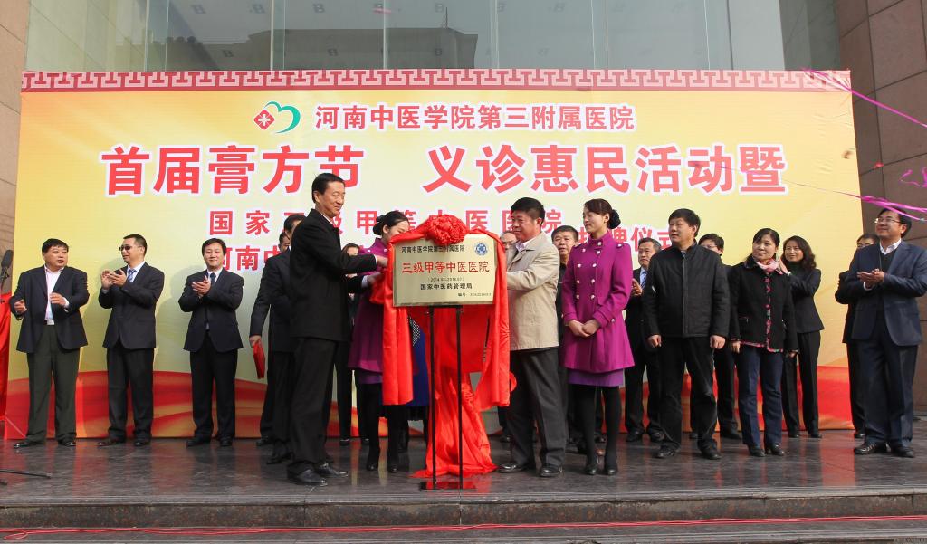 九点二十分,河南省卫生与计划生育委员会主任李广胜、河南省中医管理局综合处处长刘品、米兰(中国)党委书记孙建中、校长郑玉玲共同为三附院成为国家三级甲等中医医院及河南中医学院第三临床医院进行揭牌。