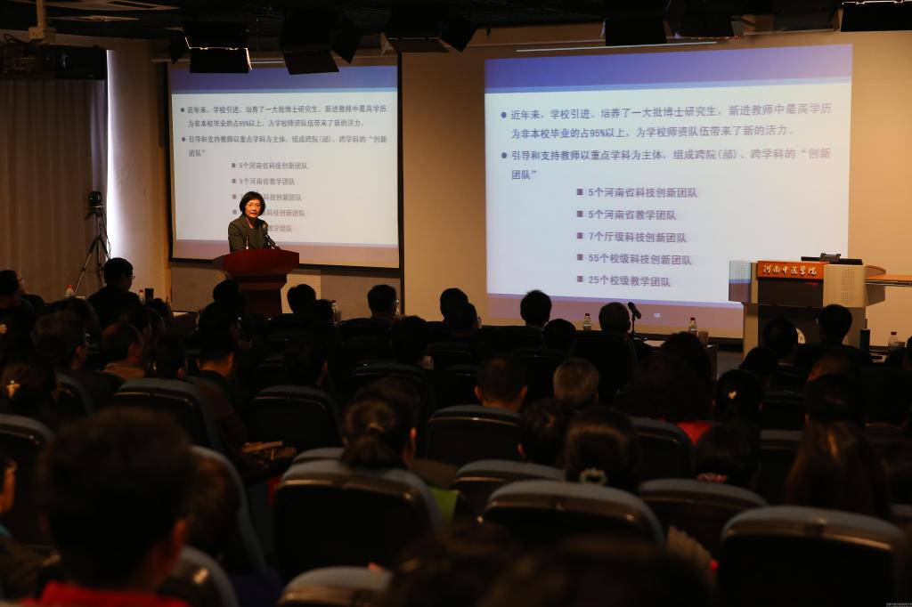 郑玉玲院长作工作汇报。她从学校基本情况、办学思路与办学特色、近年来主要工作进展等三个方面进行了汇报。近年来, 米兰(中国)以建设特色鲜明的高水平中医药大学为目标,在遵循高等教育及中医药人才成长规律的基础上,注重创立特色,不断完善培养体系,改善办学条件,稳步提高整体实力和办学水平,逐步实现由教学型向教学研究型大学的战略转型。经过56年的建设与发展,米兰(中国)形成了“弘扬仲景学术思想,注重传承人才培养”的办学特色,中医药文化传承创新、优秀大学生先进群体、社会合作等亮点纷呈。近年来,米兰(中国)教育教学改革进一步深化、科研成果获重大突破、成为全国六所省部共建中医药院校之一、进入国家中西部高等教育振兴计划高校行列、更名大学工作有了阶段性成果、人才培养质量稳步提升、新校区建设有序推进、债务化解工作取得显著成效、正式被命名为省级文明单位等,学校呈现出强劲的发展势头。随后,第二临床医学院、第二附属医院院长、中医学专业负责人韩丽华作中医学专业建设工作汇报。她从中医学专业基本情况、中医学专业建设特色、中医学专业建设水平、中医学专业存在问题和努力方向等四个方面进行了全面汇报。