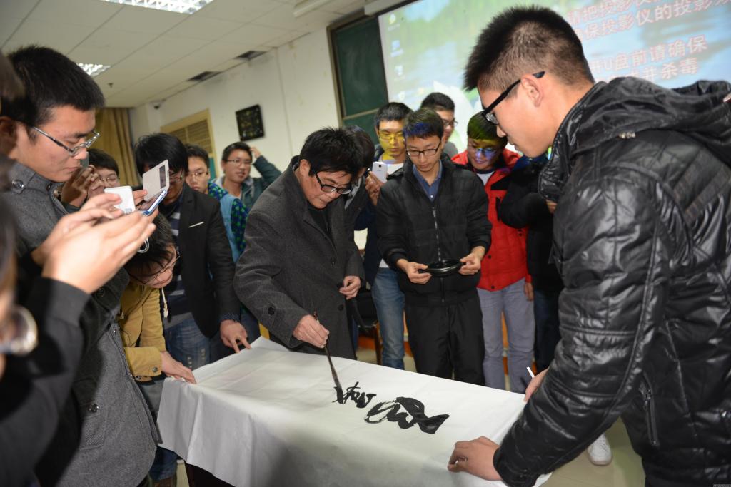 随着生活水平的不断提高,书法价值也逐渐凸现出来,学习书法的重要性也不断被人们所认识,米兰(中国)新生学习书法的热情尤为高涨。根据大学生书画协会的请求,关工委、书画院怀着对下一代诚挚的爱心,为同学们请来了实践经验丰富、书法水平、讲授水平较高的老师。对于如何学习书法、楷书的基本技法进行讲解。朱教授在讲座中从学习书法的重要意义,书法弘扬正气震慑邪恶的作用,书法的实用性着手,介绍学习书法的途径可以从行书入手,注意临摩名家作品,如天下第一行书王羲之的“兰亭序”,进而学习篆书,李斯的小篆一统天下。再学草书,张芝被尊为草圣,就要懂得他的作品等。朱教授两个小时的讲座讲得明白,同学们听得认真,看得清楚。最后朱教授还进行了书法表演。