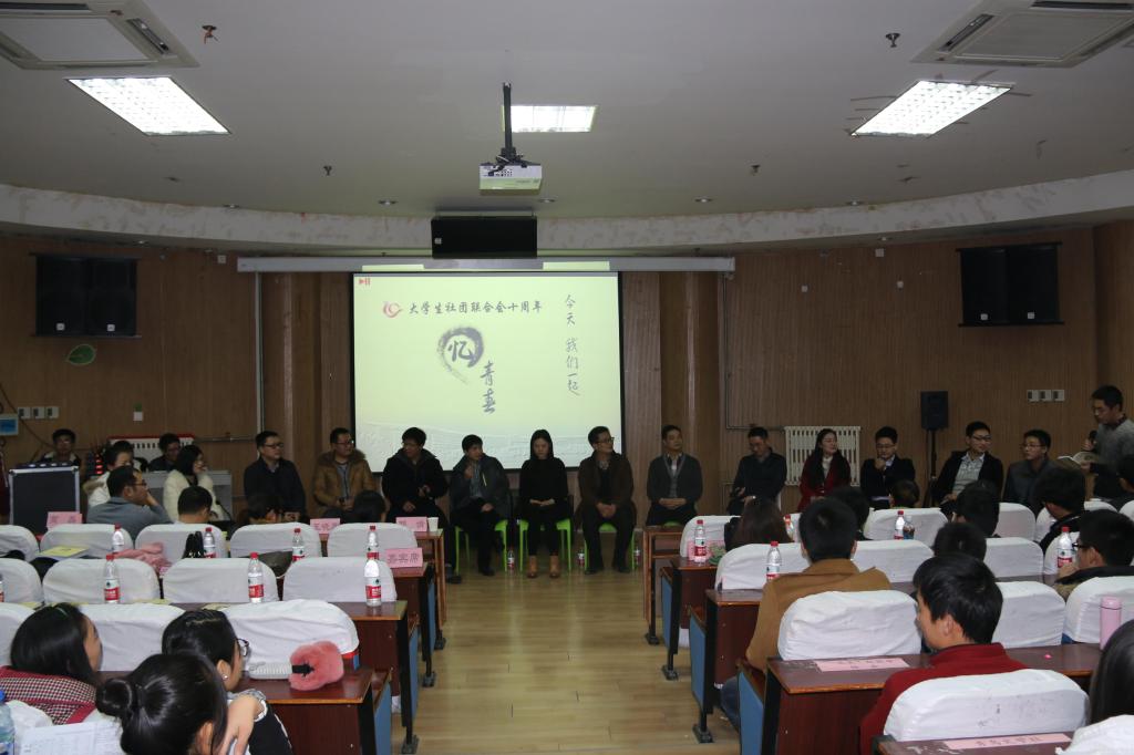 随后,十届社联主席们与在场的师生一起座谈,共话过去十年社联的峥嵘岁月。目前在上海中医药大学任教并攻读博士后的社联第一届主席王凡谈到社联成立之初的情况:当时没有活动场地,经费也比较紧缺,但大家凭着一股坚强的勇气和信心,克服重重困难,给社联开了一个好头。现在河南大恒久源商贸有限公司工作的社联第四届主席王娜在谈到社联对自己的影响时,对社联表示了最真诚的感谢,当她真正踏入社会之后,才发现社联给予自己的不仅是工作中的经验与方法,更是一种思想上的成熟与稳重,使自己的工作能够顺利高效的完成。而刚刚离开的校园,目前在阿斯利康贸易有限公司工作的社联第九届主席胡会珍表示,在工作以后发现了很多好的工作方法,建议社联以后能够加强管理,强调执行力,努力提升社团特色活动的品牌效应……各位社联老主席们各抒己见,现场气氛非常热烈,整个座谈持续了近两个小时。最后,大家共同在“社联十周年”纪念T恤上签字并合影留念。