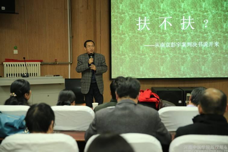 王新志教授把当下人们“不扶”的原因归结于两个方面,一是由于社会上确实有出现了一些负能量的事情,人们怕被讹诈而不敢救助。二是由于缺乏必要的医学知识而“不会扶”。王教授还从毛泽东同志“救死扶伤,实行革命的人道主义”的题词以及“毫不利己专门利人”的白求恩精神谈起,倡导大家要发扬这种精神,要多做好事、善事,自己的大脑也会受到奖赏。接下来,王教授重点讲解了“怎么扶”的问题。即一是要智慧科学的“扶”,首先要学会保护自己,依靠仔细辨别真伤假伤,可以用手机录音录像保存证据,或请求旁人作证等。二是要掌握公民必备的急救知识,要防止关键时刻帮倒忙,或错过最佳的黄金救援时间。并针对出现晕厥、昏迷、癫痫、中毒、意外、外伤、猝死等7种情况如何施救进行讲解。人文学院段晓鹏副院长则以当年轰动全国的彭宇案为例从道德伦理、法律的角度向师生剖析“该不该扶,如何扶”的问题。他还与大家一起分享了自己微信圈中朋友和同学们对于“扶不扶”的看法,很多人都表示“一定要扶,这个没商量,讹人的毕竟是少数。其实,关于扶不扶的答案是非常明确的,无论从道德层面还是从法律层面,我们在提高自身保护意识和做好保护措施的前提下,一定要毫不犹豫起扶起需要帮助的人,让我们中国民族的传统美德传承发扬。
