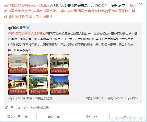 校团委组织团员青年在新浪微博开展以“清明祭英烈,传承红色基因”为主题的清明节祭奠英烈活动,共吸引了3914名学生参与。各大学生社团也积极响应,阳光青年志愿者协会、擎风文学社、花样年华礼仪社等76个社团踊跃参与,通过网上献花、点烛上香、主题征文等方式纪念先烈。活动期间,汉风show协会在全校范围组织开展了清明节征文活动,同学们积极参与,写下了自己对清明节的感悟和对革命先烈的崇敬之情。来自外语学院2012级医学英语专业一班的葛丹丹同学用文字传达了对先人的感恩与缅怀,向大家深入地诠释了清明节这一传统节日的文化内涵,最终取得了本次征文比赛的一等奖。