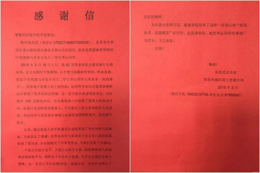 几天之后,老人的家属宋先生辗转数次联系到了李沁同学,再三表示要当面感谢,都被他婉拒了。李沁回到学校以后,宋先生依然表示要来学校感谢他助人为乐的行为,李沁再次婉拒。随后,宋先生向学校团委寄来了一面写有“助老扶危道德模范”的锦旗和感谢信,并由校通讯社对其进行了采访,在微博中发布了李沁同学的感人事迹。自始至终,李沁同学都没有向任何人提及此事,直到辅导员老师开支部会议时,其他同学说起看到过这篇微博,大家才知道了他的助人行为。