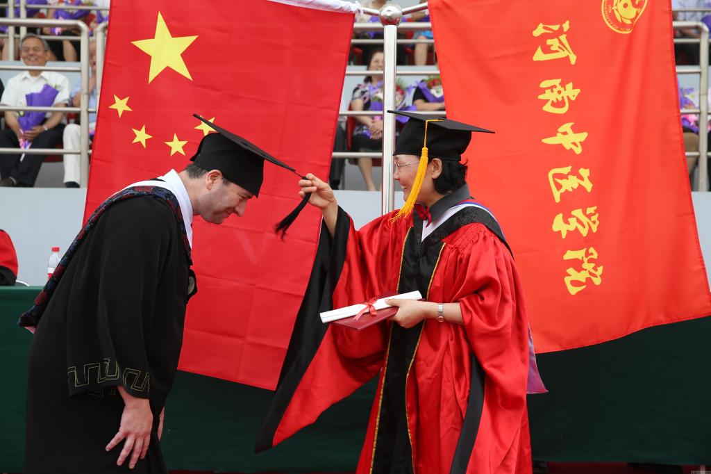 学位委员会主席、院长郑玉玲为优秀毕业生代表扶正流苏