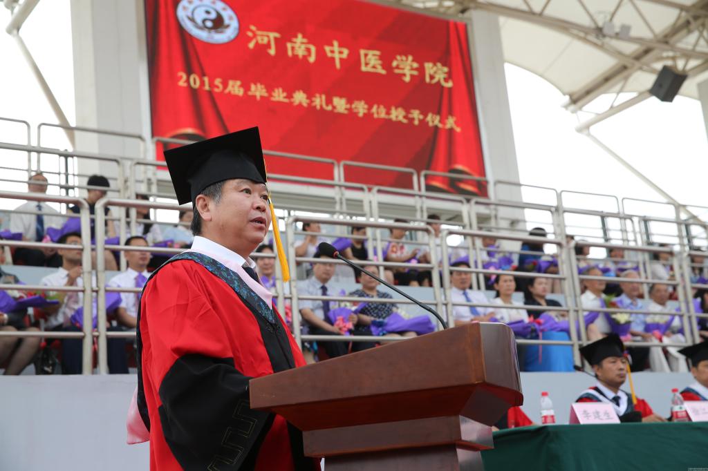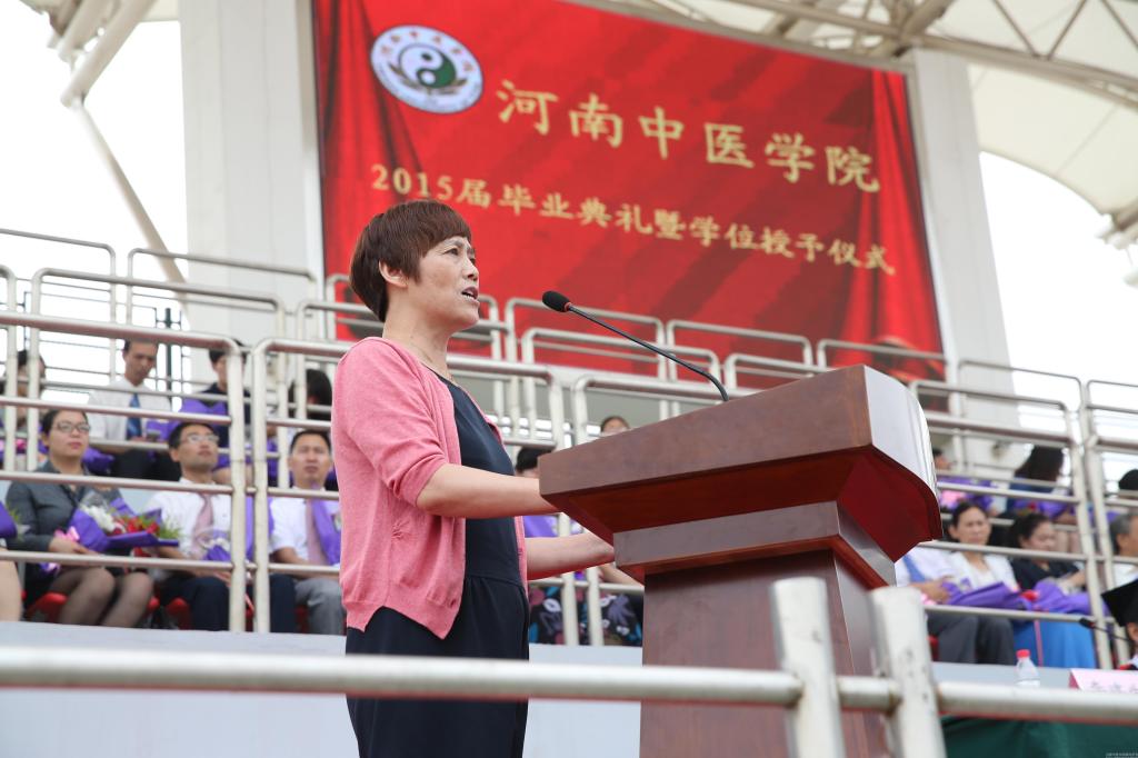 院长郑玉玲发表了热情洋溢的致辞。她说,在多部门的共同努力下,河南中医药博物馆和新图书馆均提前开放,只为2015届毕业生能在离校之前去坐一坐,翻一翻书,算是代表学校为毕业生送上了毕业礼物。她回顾了2015届毕业生和学校同甘共苦、共同成长进步的大事件,细数了2015届毕业生中的优秀代表,并借“循正而行 自与吉会”之名言,深情寄语2015届全体毕业生:
