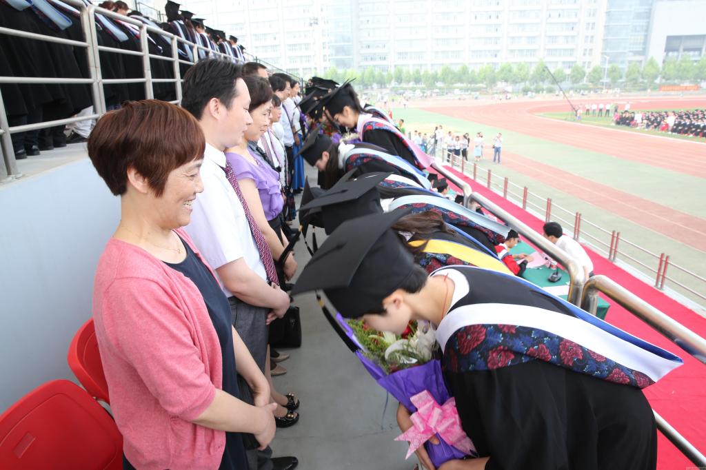 典礼仪式伊始,现场全体人员起立,齐唱国歌。60名优秀教师代表共同接受毕业生代表的三鞠躬献花致谢。