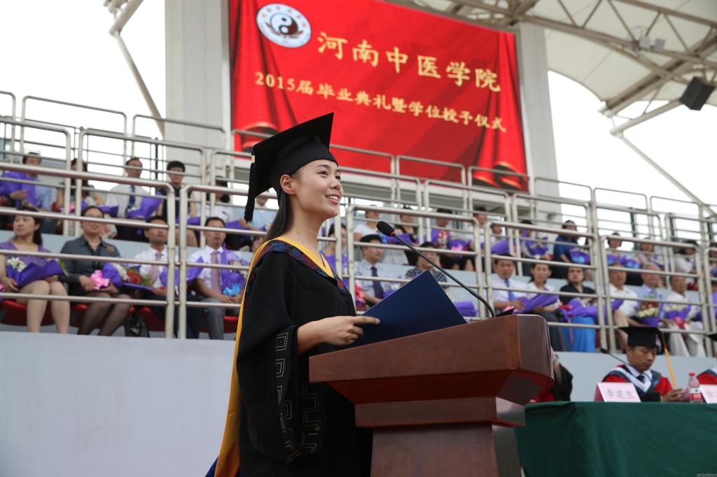 毕业生代表、药学院2011级中药制药专业马蕊同学代表全体毕业生向母校道别,感谢各位老师的关心和教育,毕业后会时刻牢记“厚德博学,承古拓新”的校训,不忘初心,以母校的精神激励自己,做一个胸怀大志而脚踏实地的人,一个富有责任并勇挑重任的人。