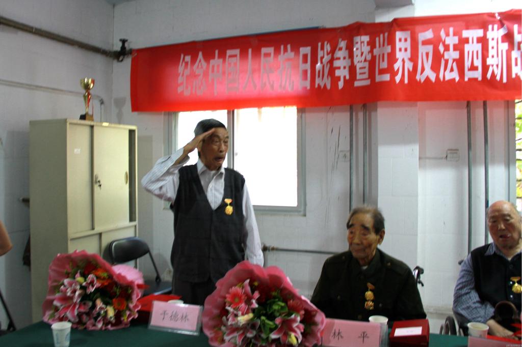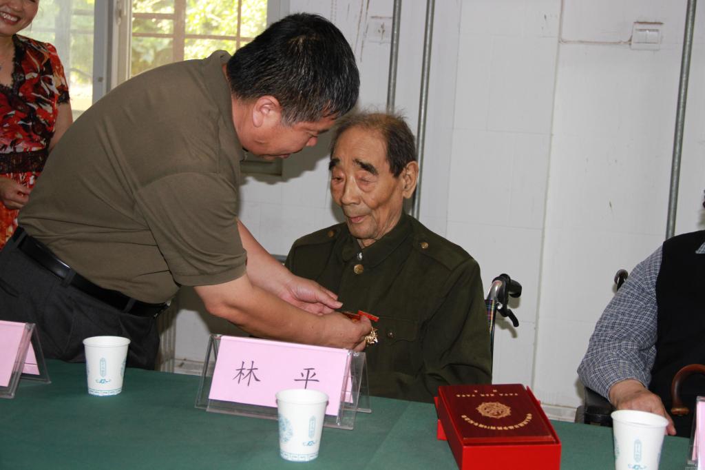 党委书记孙建中为抗战老英雄林平佩戴中国人民抗日战争胜利纪念章