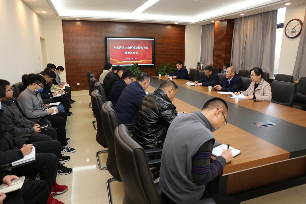 本网讯(文/张马玉 图/李昕)为深入推进全面从严治党,切实加强医院党风廉政建设和反腐败工作,进一步提升医院基建领域廉政风险防控能力,确保龙华医院河南医院建设工作健康平稳开展,营造风清气正的干事创业氛围,2021年12月17日下午,二附院召开龙华医院河南医院建设指挥部集体廉政教育会,院党委书记王海亮,党委副书记、纪委书记王倩,党委副书记胡仕祥出席会议,纪委监察室、审计室、高新区院区建设指挥部、基建办公室、计划财务部、招标办公室等部门负责同志及高新区院区建设指挥部全体人员参加会议。会议由纪委副书记张正国主持。