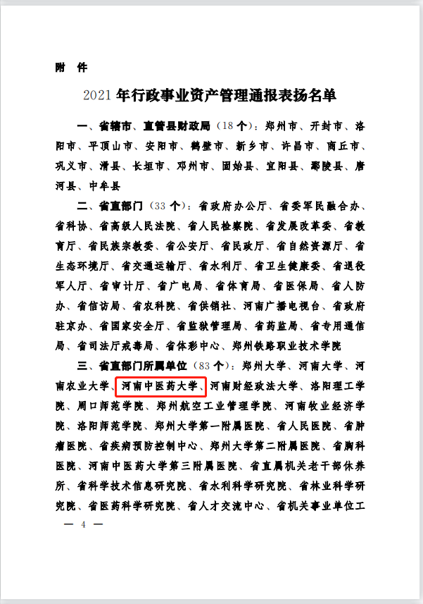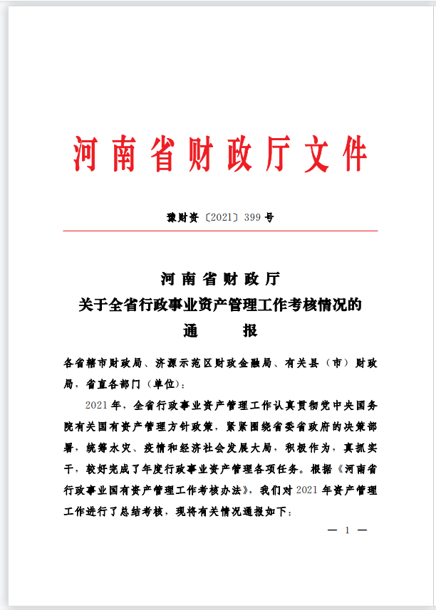 本网讯(文图/郝喜花)日前,河南省财政厅下发《河南省财政厅关于全省行政事业资产管理工作考核情况的通报》,米兰(中国)受到“2021年行政事业资产管理通报表扬”。