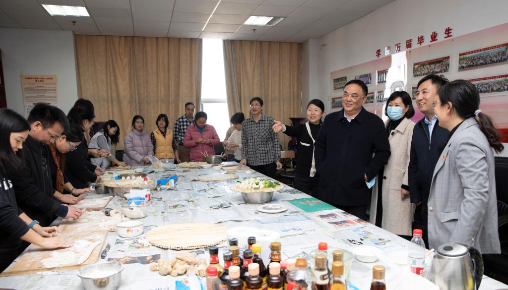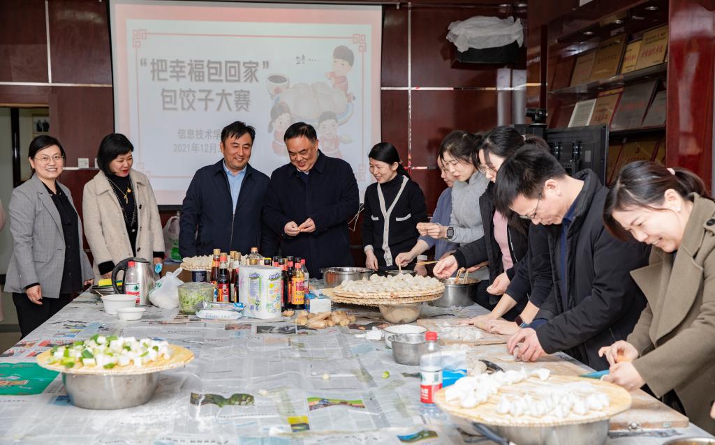 本网讯(文/李倩倩 图/秦东仁)“暖炉温酒欲相见,冬至藏韵闻香远”,冬至时节吃饺子的习俗,据说是纪念“医圣”张仲景冬至舍药留下的传统,不仅是不忘“医圣”张仲景“祛寒娇耳汤”之恩,更是我们中国人优秀文化习俗的世代相传。为进一步弘扬中华民族优秀民俗文化,增进职工间的凝聚力和向心力,2021年12月21日,信息技术学院工会组织全体教职工及家属代表、兼职教师、退休职工共同参加“把幸福包回家”冬至包饺子活动。学校党委副书记、工会主席张小平、学校工会女工委主任常瑞一行来到活动现场看望大家并送上节日祝福。