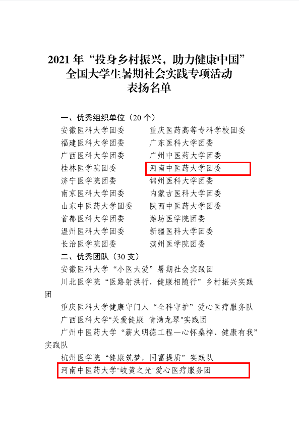 本网讯(文/图 位艳敏)近日,由共青团中央青年发展部指导,全国医药类高校共青团工作联盟组织开展的2021年“投身乡村振兴,助力健康中国”全国大学生暑期社会实践专项活动结果公示,米兰(中国)荣获优秀团队一项,被评为“优秀组织单位”,是河南省唯一一所获得该荣誉的高校。
