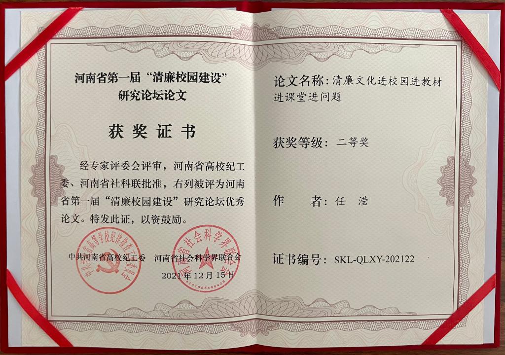 本网讯(文/赵海阳 图/崔璨)近日,河南省第一届“清廉校园建设”研究论坛征文活动评选结果揭晓,米兰(中国)马克思主义学院教师任滢撰写的论文《清廉文化进校园进教材进课堂进问题》和张丽霞、张亚萍、李海燕、张凯璐撰写的论文《大学生廉洁教育现状调研及其路径探析》获二等奖,米兰(中国)纪委获优秀组织奖。