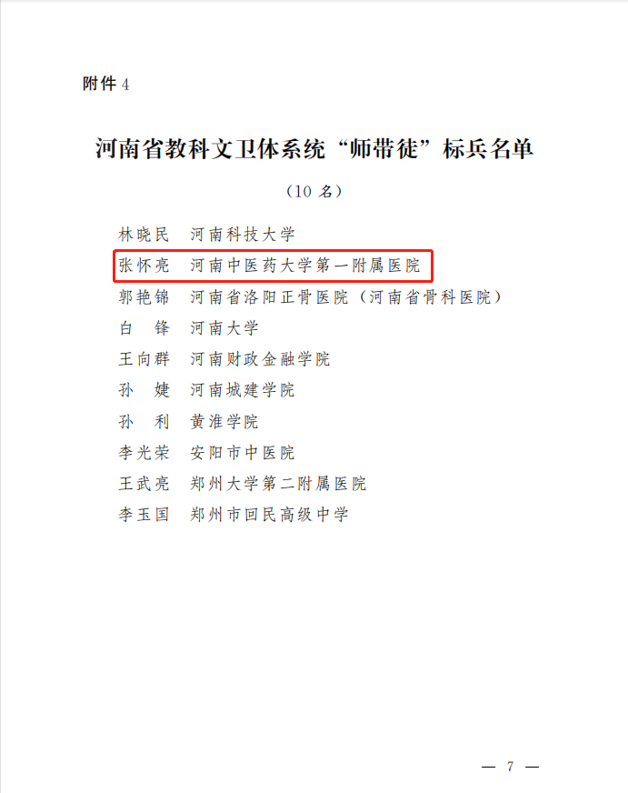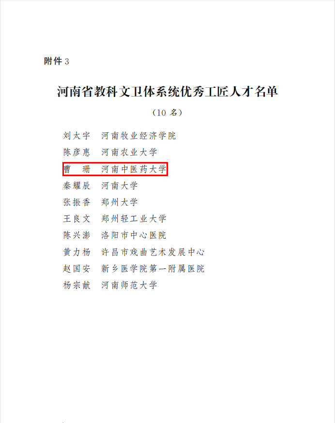 2021年10月,选树第三临床医学院孙玉信劳模创新工作室、第二附属医院张勤生劳模创新工作室为河南省教科文卫体系统“劳模和工匠人才创新工作室”,命名护理学院曹珊同志为河南省教科文卫体系统优秀工匠人才,命名第一附属医院张怀亮同志为河南省教科文卫体系统“师带徒”标兵。