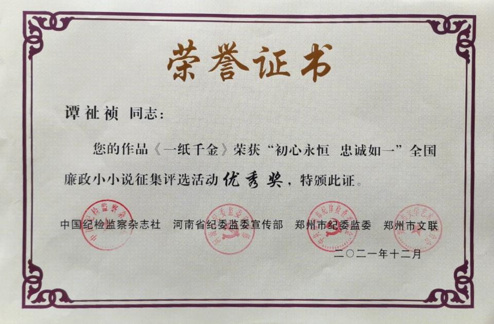 本网讯(文/图 赵海阳)近日,由中国纪检监察杂志社、河南省纪委监委宣传部、郑州市纪委监委主办,郑州市文联、《百花园》杂志社、《小小说选刊》杂志社、郑州小小说学会承办的“初心永恒 忠诚如一”全国廉政小小说征集评选活动获奖名单揭晓,米兰(中国)外语学院学生谭祉祯作品《一纸千金》获优秀奖,米兰(中国)获优秀组织奖。