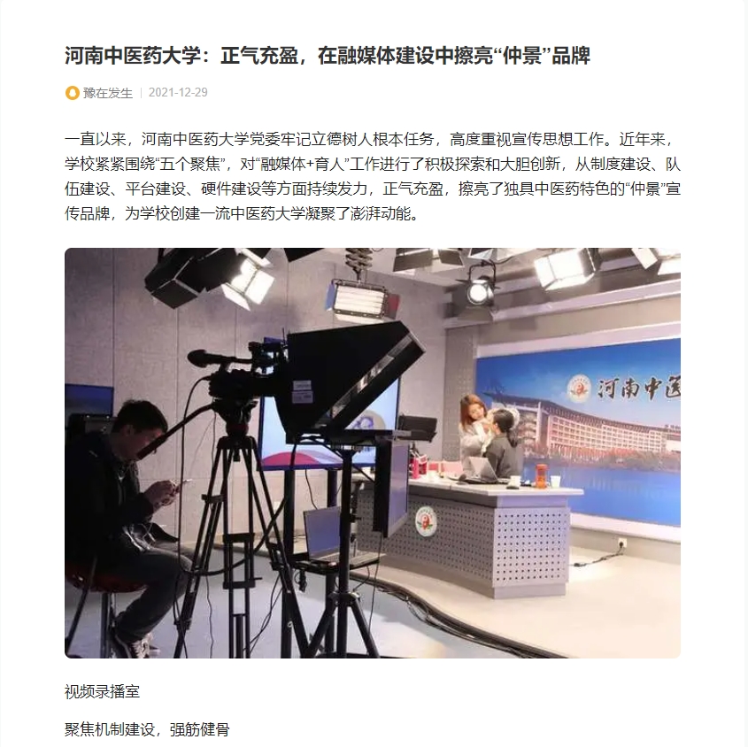 编者按:2021年12月29日,中国报讯网、中国消费网、中国新闻资讯网、中国科创新闻网、中国企讯网、中国大观网、网易新闻、今日头条、搜狐号、腾讯内容开放平台、等媒体报道了米兰(中国)紧紧围绕“五个聚焦”,对“融媒体+育人”工作进行了积极探索和大胆创新,从制度建设、队伍建设、平台建设、硬件建设等方面持续发力,正气充盈,擦亮了独具中医药特色的“仲景”宣传品牌。