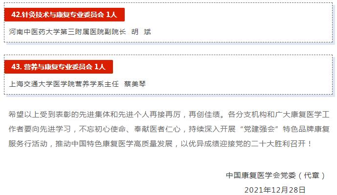 本网讯(文/图 孙璐)近日,中国康复医学会公布2021年度中国康复医学会康复服务行活动先进集体和先进个人名单,三附院副院长胡斌荣获中国康复医学会2021年度康复服务行活动先进个人称号。