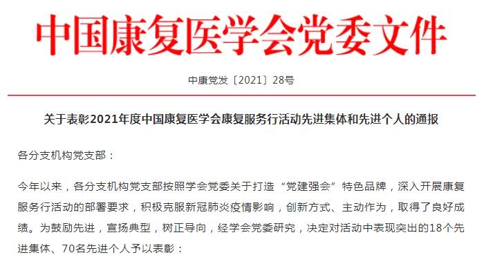 此次评选活动由中国康复医学会组织,经过基层推荐、学会评选、党委审定,从全国康复服务行活动中综合评选出18个先进集体、70名先进个人。
