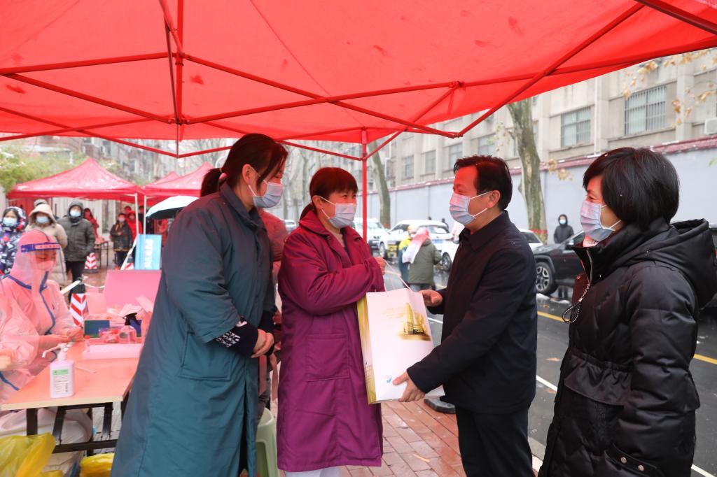 天寒地冻,紧随队员出征的还有医院领导的牵挂和关怀。翟剑波,院党委委员、工会主席乔东鸽等领导和同志们深入到各检测点,及时把热暖用品和关怀问候送给每一个在寒风中奋战的队员。