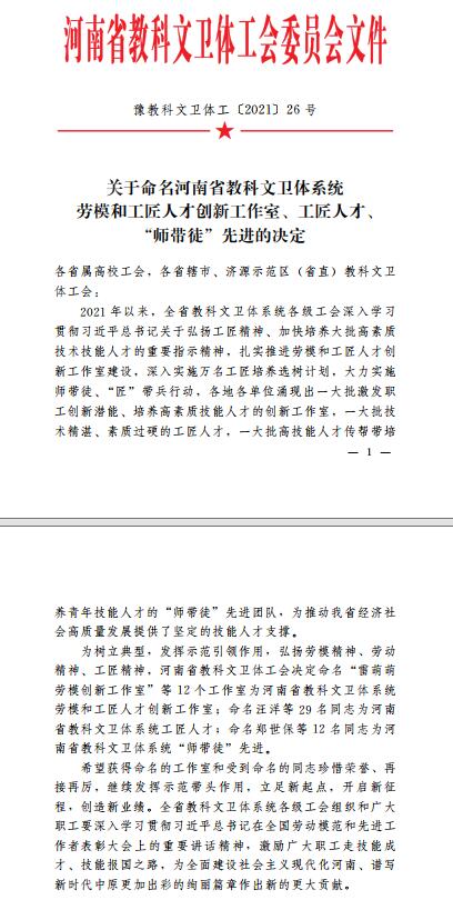 本网讯(文图/姜楠)近日,河南省教科文卫体工会公布“劳模和工匠人才创新工作室、工匠人才"评选结果,三附院刘佃温劳模创新工作室被命名为“河南省教科文卫体系统劳模和工匠人才创新工作室”,康复科二病区主任吴毅明荣获“工匠人才”荣誉称号。