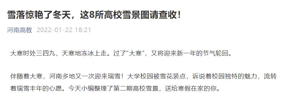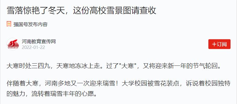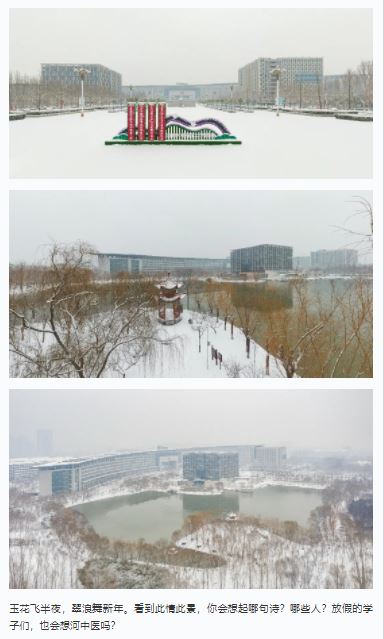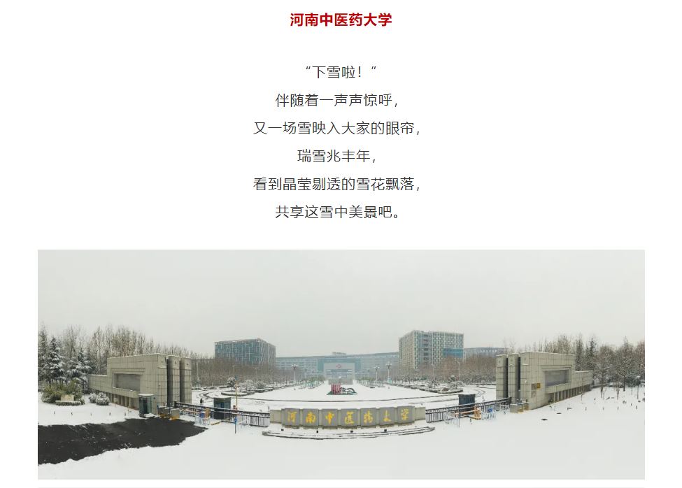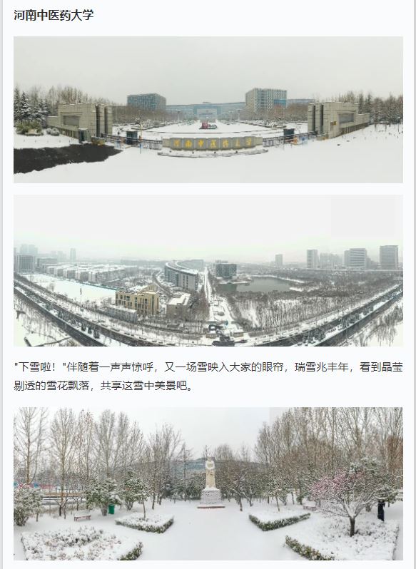2022年1月22日,学习强国号、河南高教官方微信报道了米兰(中国)的校园雪景。
